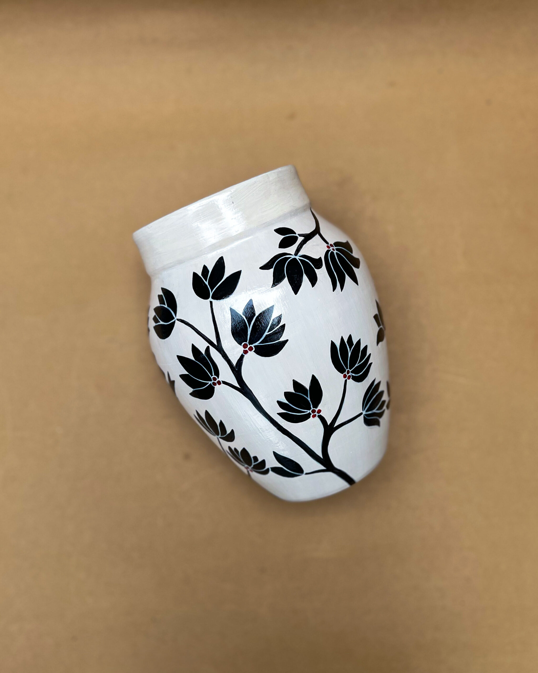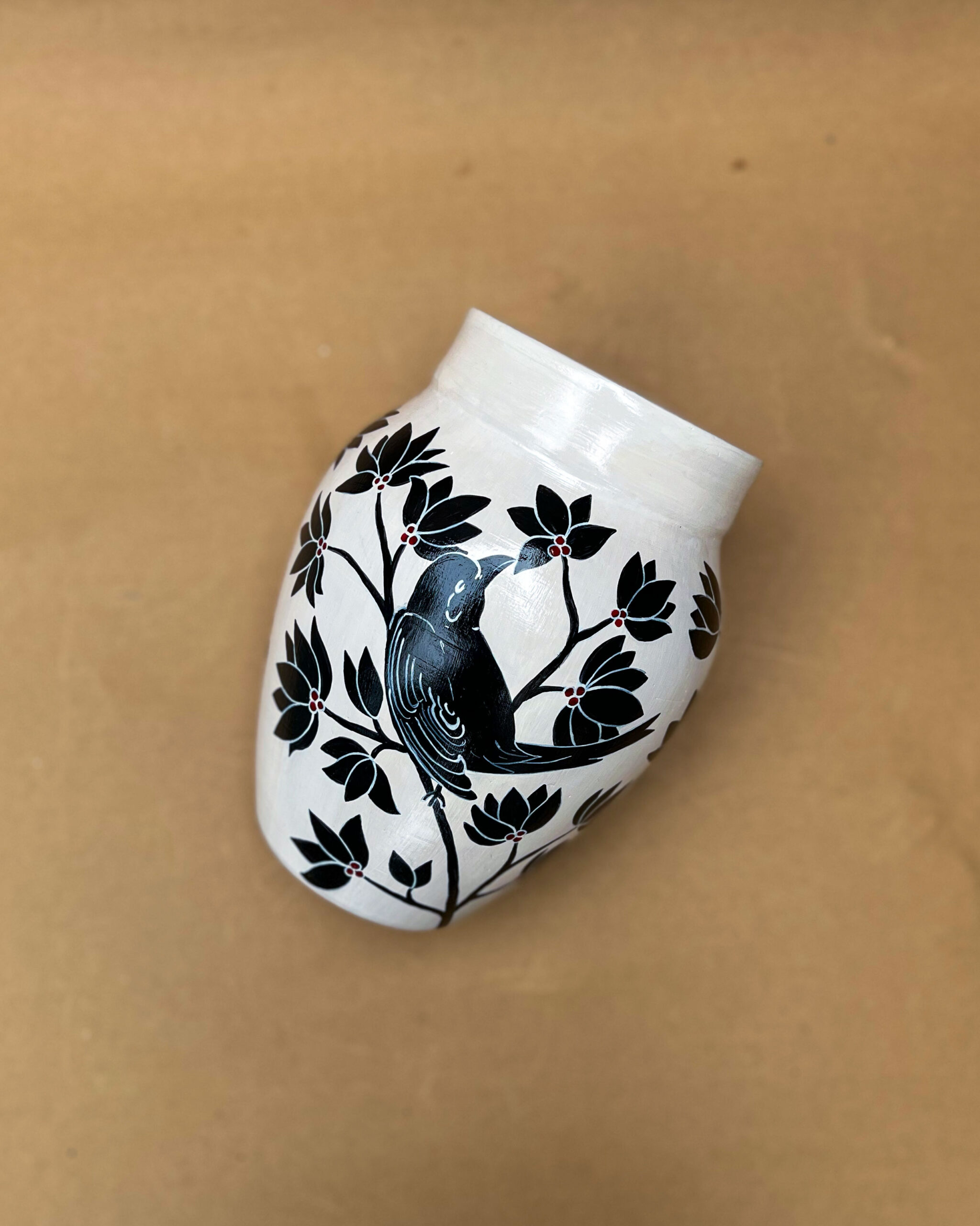 A hand-painted white vase featuring a black bird nestled among delicate black leaves and red-accented berries. Minimal, bold, and timeless — this piece adds quiet elegance to any modern or traditional space.