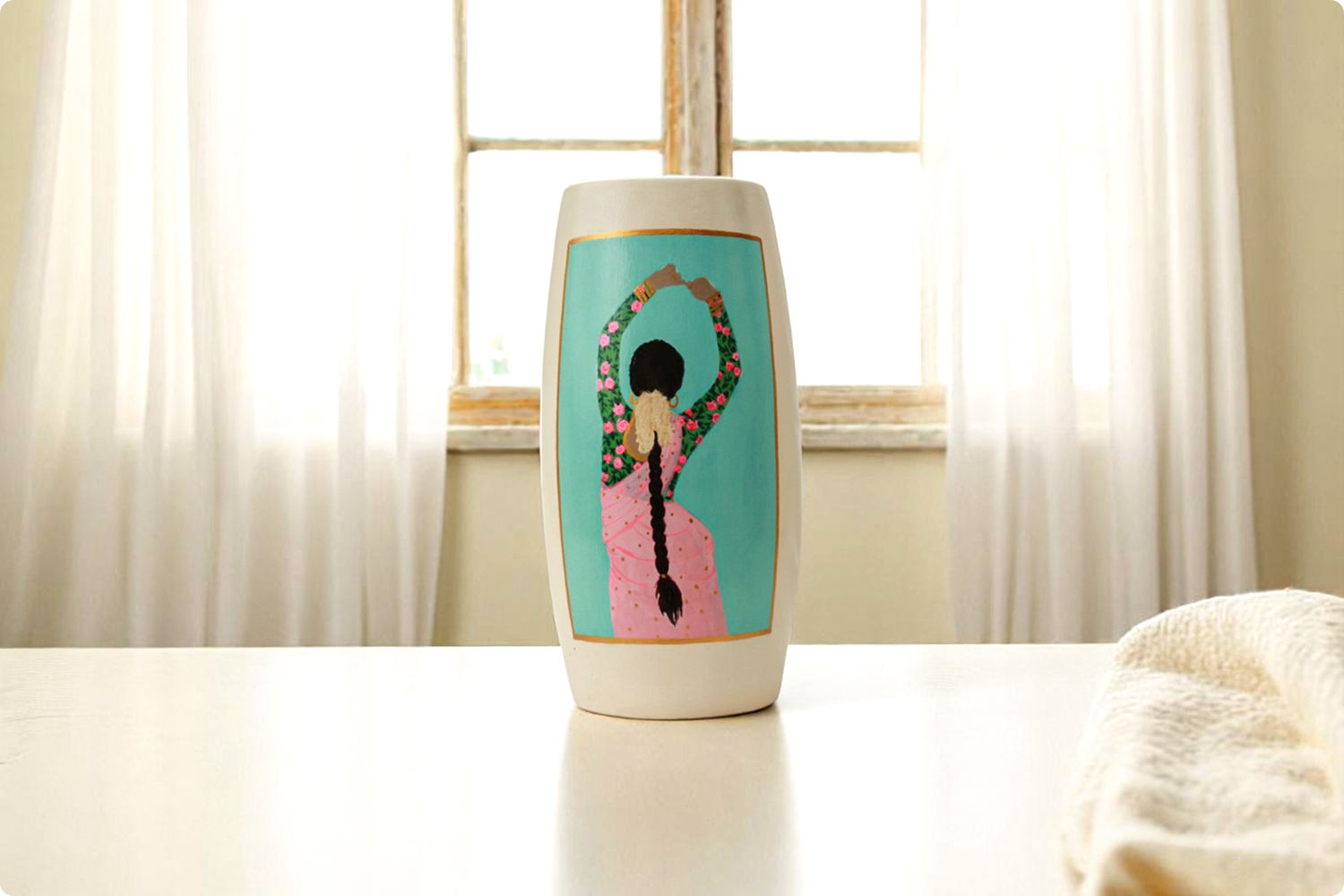 Celebrate grace and tradition with our Gulabo Serenity ceramic vase, featuring a hand-painted South Asian woman in a pink saree with floral details. This statement decor piece adds a soulful, cultural touch to modern interiors. Ideal for those seeking desi aesthetic home decor or collectible art vases with ethnic charm.