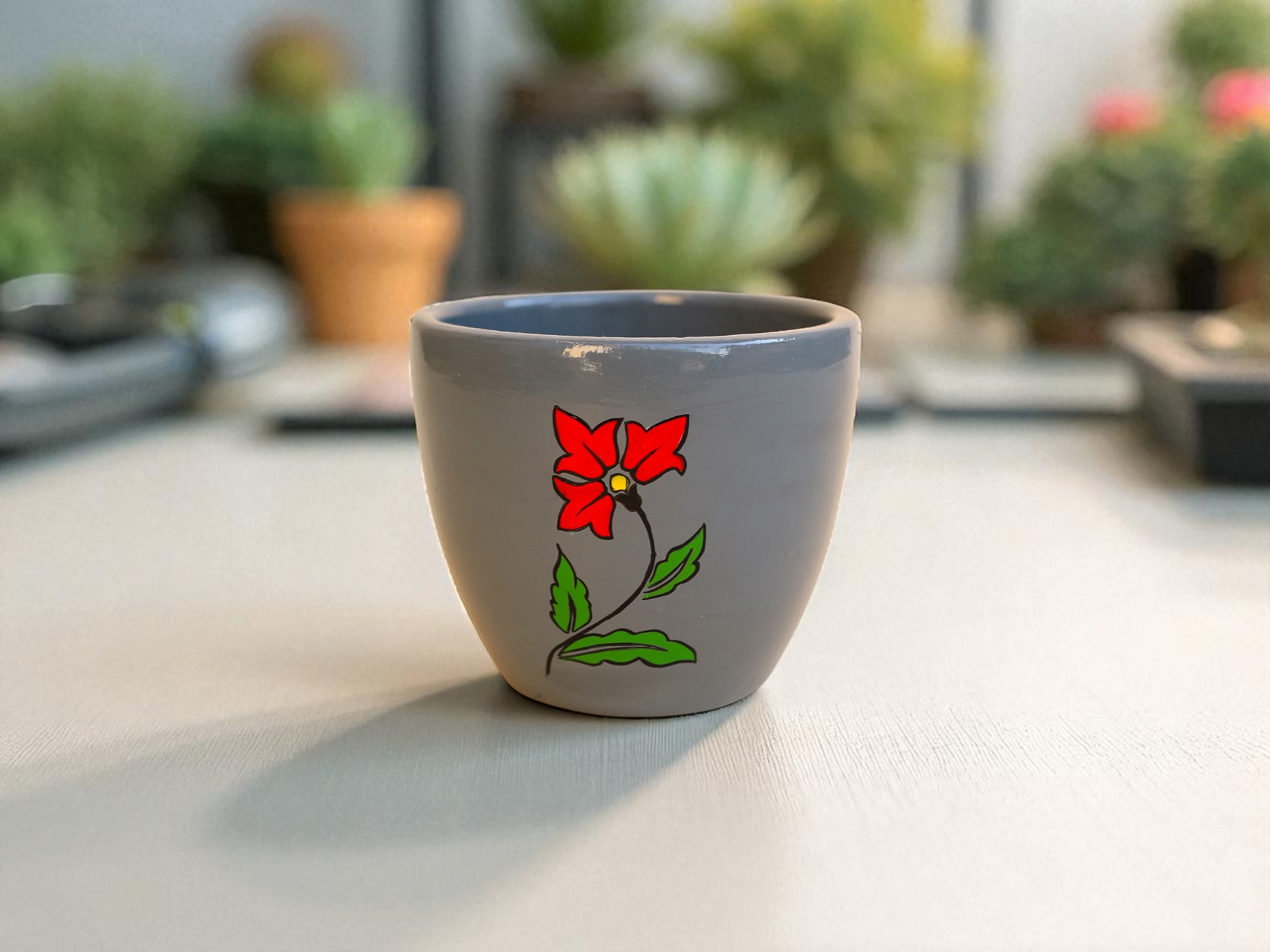 A hand-painted grey pot featuring a bright red flower with green leaves. A bold yet minimal floral design to add charm to your table, shelf, or plant corner.
