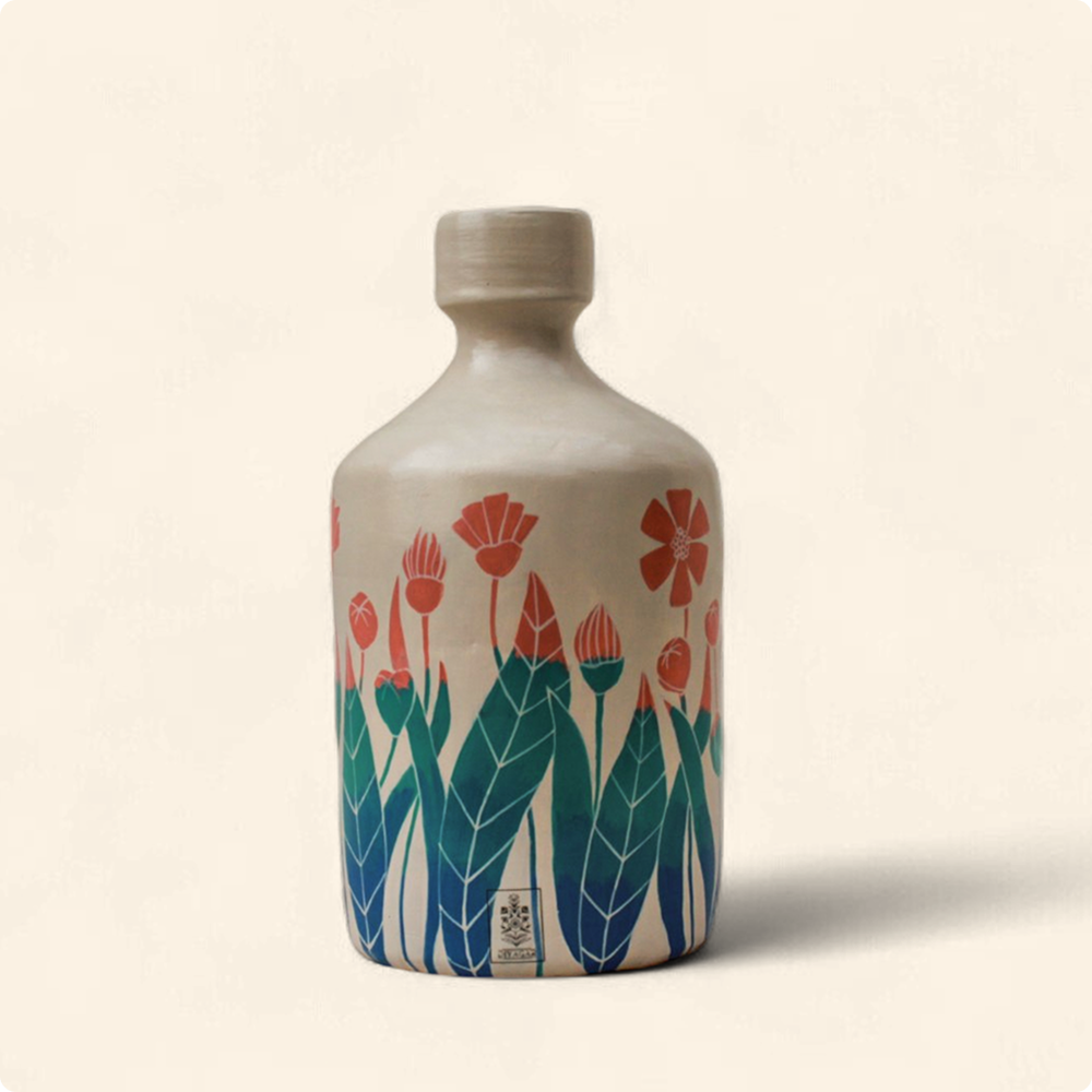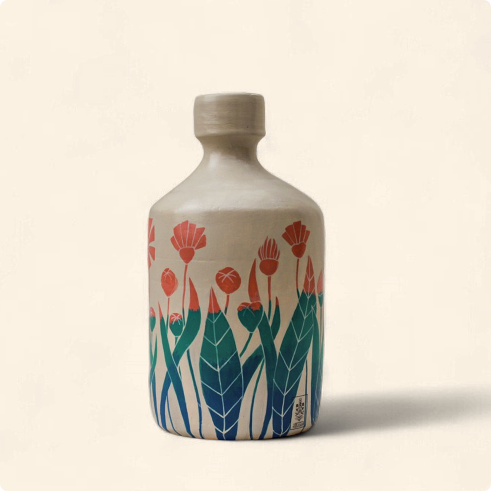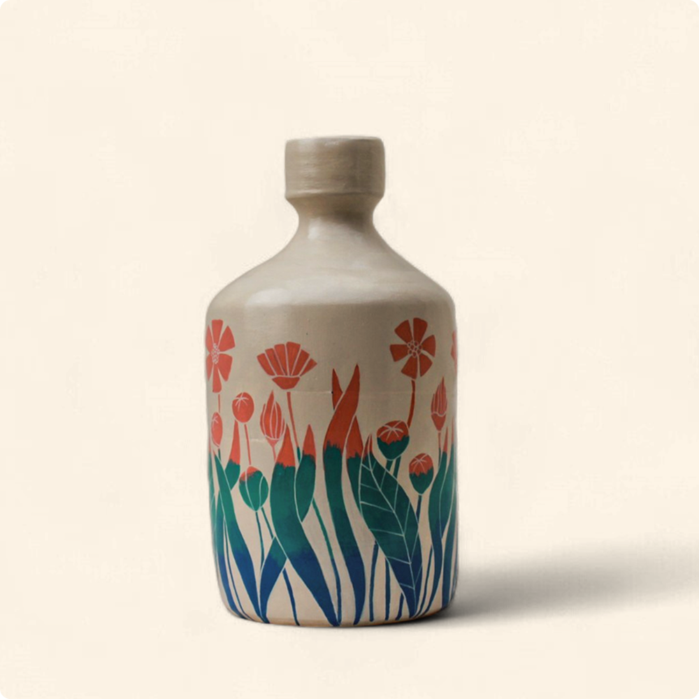 Handcrafted and hand-painted ceramic bottle vase featuring a 360° floral garden design in soft coral and teal tones. This flower-patterned pottery piece brings a fresh spring feel to any corner of your home. Perfect as a decorative flower vase or statement tabletop accent. Ideal for boho, rustic, or earthy home decor themes.