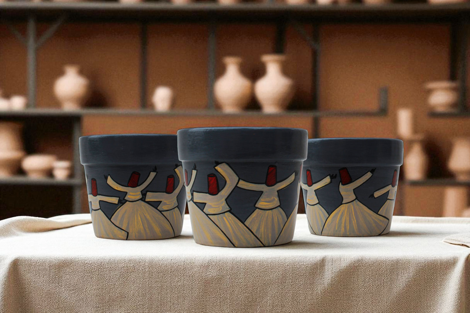 A hand-painted pot showing whirling dervish figures in motion, inspired by Sufi tradition. A meaningful addition to your décor that blends spirituality and art.